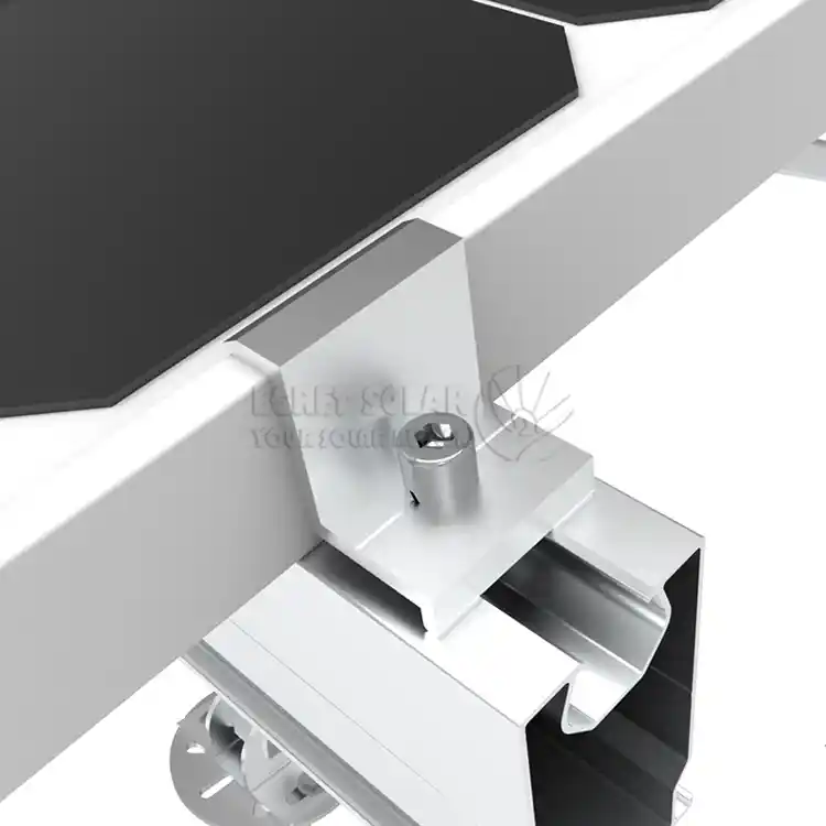 แคลมป์ปลายพลังงานแสงอาทิตย์ยึดโครงส่วนประกอบด้านนอกสุดของแต่ละแถวเข้ากับปลายรางไม่ให้หลุดออก ในเวลาเดียวกัน การกดที่ขอบของส่วนประกอบช่วยลดการบุกรุกของลม ฝน และฝุ่นจากด้านข้าง ซึ่งตั้งอยู่ที่ขอบของอาร์เรย์และรับแรงยกลมที่แข็งแกร่งที่สุด (แรงดึงขึ้น) และแรงดูดลมโดยตรง ซึ่งถือเป็นจุดรับแรงหลักในการออกแบบที่ต้านลมและต้องมีความแข็งแรงทางกลเพียงพอ